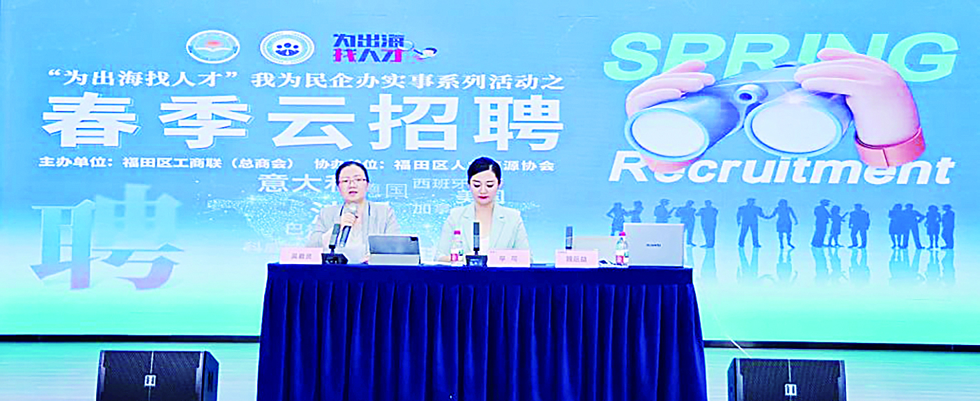 本报讯 (深圳侨报记者 谢青芸 通讯员 胡丽娴) 近日,福田区工商联(总商会)举办春季云招聘,通过线上实时互动推介企业、直播带岗,帮助民营企业招揽具有国际视野和专业技能的优秀人才。
