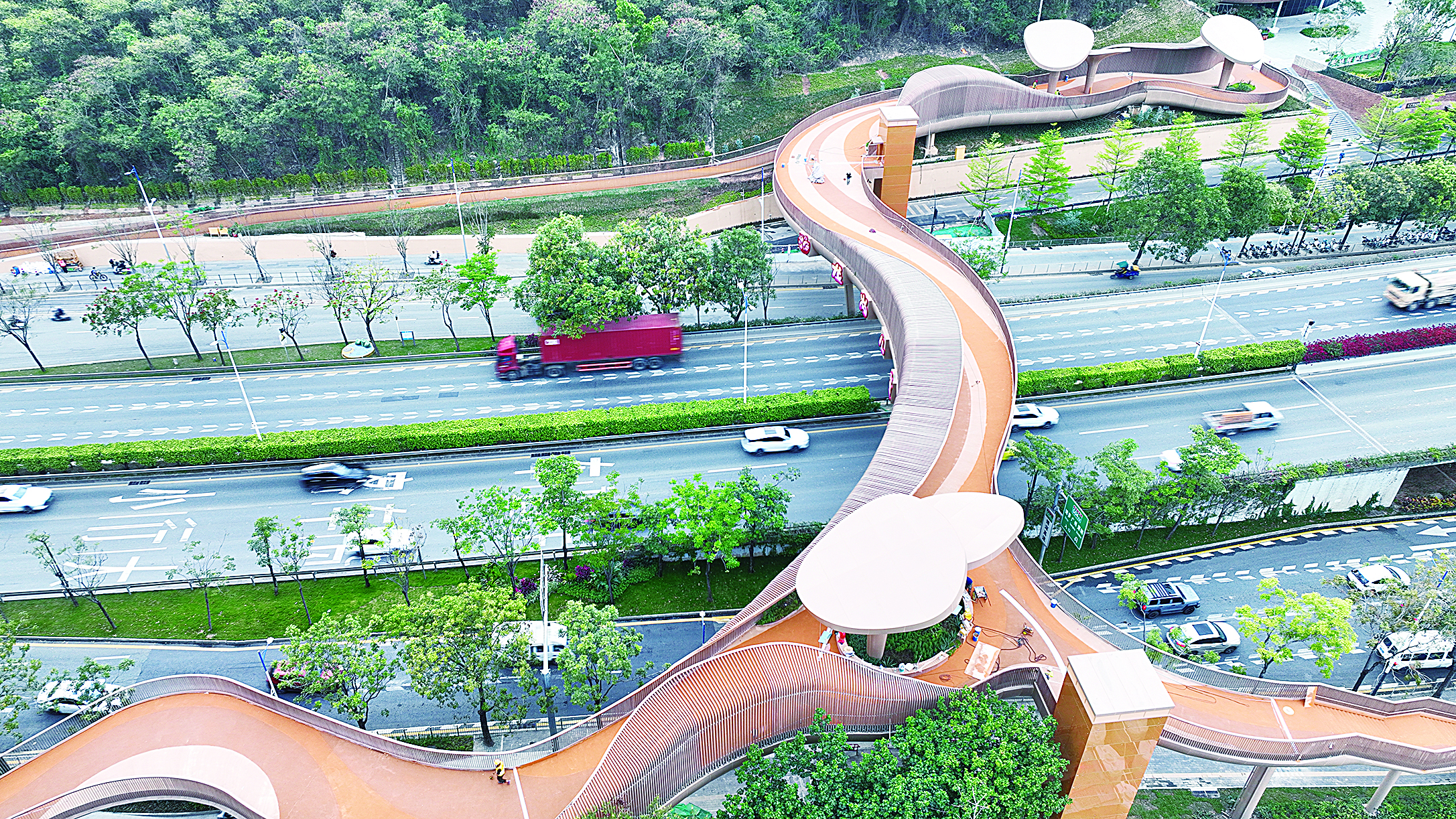 近日,龙岗儿童公园配套连接通道工程已全面完工并进入验收阶段,标志着该项目开通进入倒计时。这座“空中连廊”全长142米,开通后将串联儿童公园与龙岗中心城区,不仅为公园门户再添一道风景线,更构建起“公园—商圈”的立体化连接通道。图为已完工的“空中连廊”。龙岗融媒通讯员 夏志成 摄