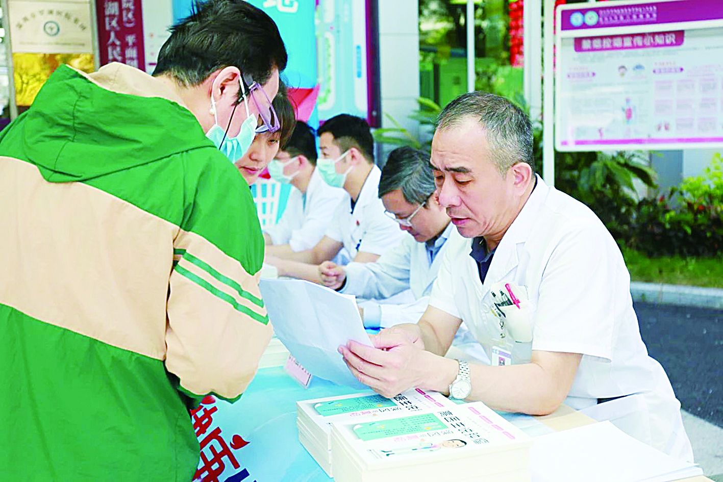 首场活动在金光华广场举行,支部党员专家聚焦胃癌防治,开展科普宣传和义诊。在布心社区天韵府小区广场,多学科专家为百余名居民提供肿瘤筛查和健康咨询服务。在罗湖区人民医院门诊大厅,放射治疗科、药学部等专家为市民义诊,并赠送防癌科普读物,构建起医患沟通的暖心桥梁。