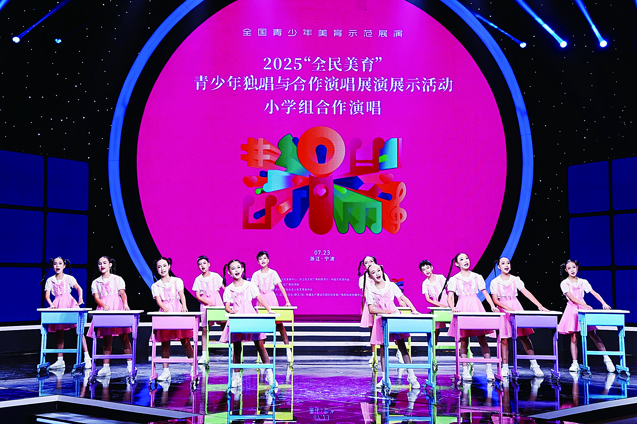 7月23日,在浙江宁波举行的全国青少年美育示范展演上,来自龙岗区坂田街道的童声表演唱原创作品《时钟嘀嗒嘀嗒》精彩亮相。图为全国青少年美育示范展演现场。