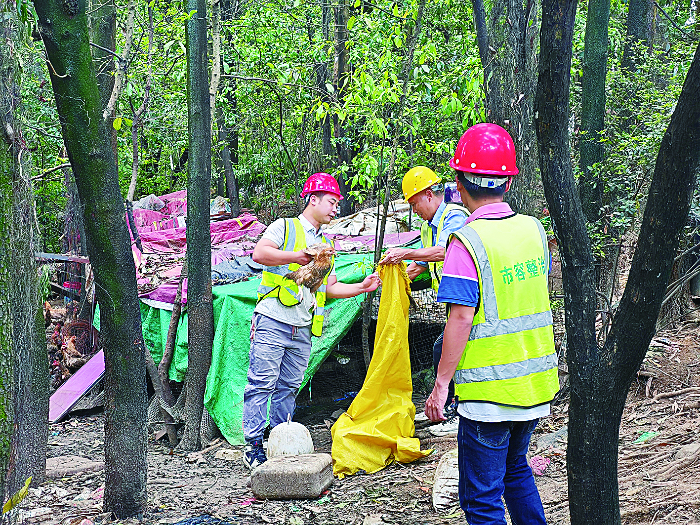 由于饲养者不在现场,且该林地管理权归属其他部门,执法人员第一时间对散养的活禽进行暂扣,并详细记录窝棚、鸡舍的搭建位置和破坏林地的具体情况。随后,龙城街道将相关问题反馈至林地管理部门。7月26日至 27 日,龙城街道执法人员拆除约20平方米的窝棚和鸡舍,清运走残留的粪便和垃圾。