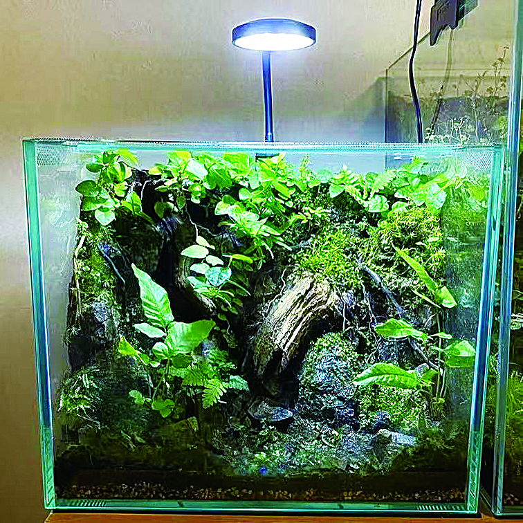 阳光穿过玻璃窗,在阳台投下斑驳的光影。茶几上的玻璃瓶里,苔藓舒展着嫩绿的叶片,鹅卵石旁的蕨类植物顶着晶莹的露珠——一座指尖大小的“森林”正悄然生长。这不是植物标本展示,而是龙岗教育工作者李科军打造的微景观。