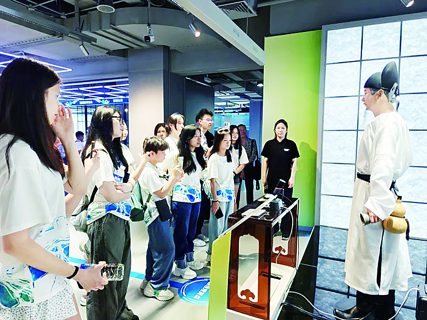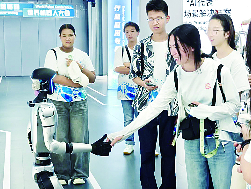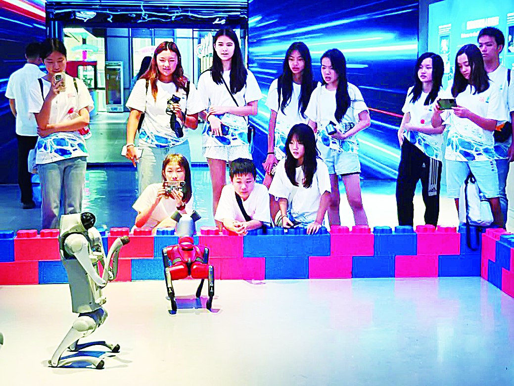 8月5日,参加2025年华裔青少年音乐夏令营的近百名营员走进北京亦庄机器人大世界,近距离感受机器人技术在工业、医疗、居家生活等领域的最新应用成果。