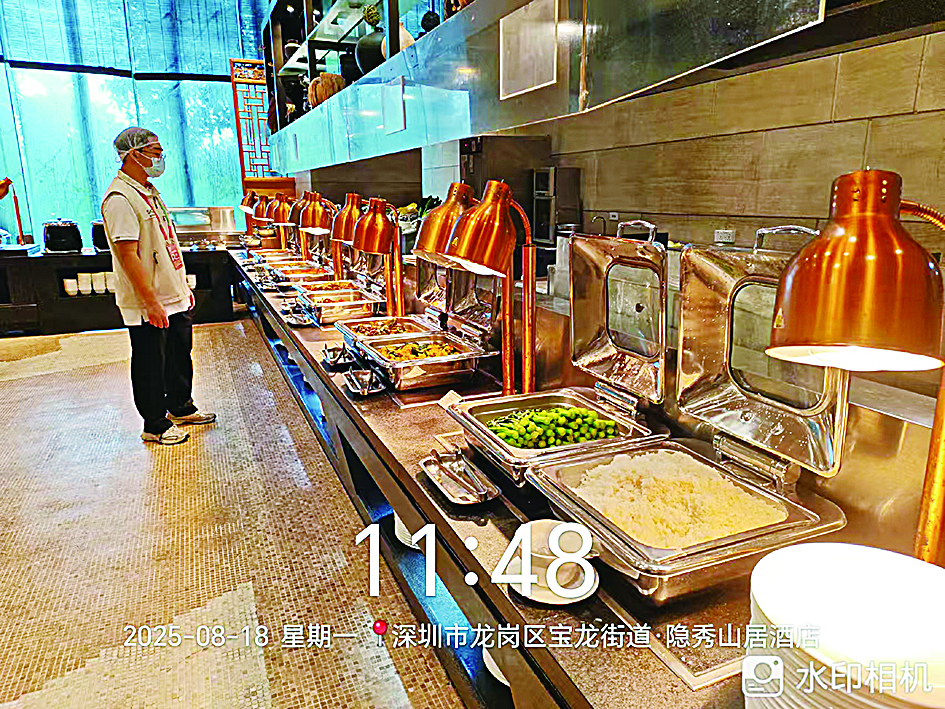 在龙岗隐秀山居酒店报到处,十五运会门球项目赛事工作人员有条不紊地引导技术官员、裁判员办理报到手续,现场领取资料、赛事服装和登记入住。同时,赛事保障组在技术官员就餐前完成餐具检测,现场井然有序。
