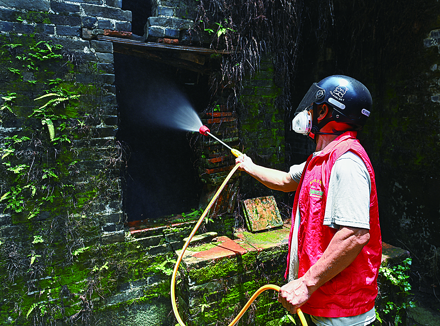 7月25日,工作人员在佛山市顺德区庄头村喷药消杀蚊虫。