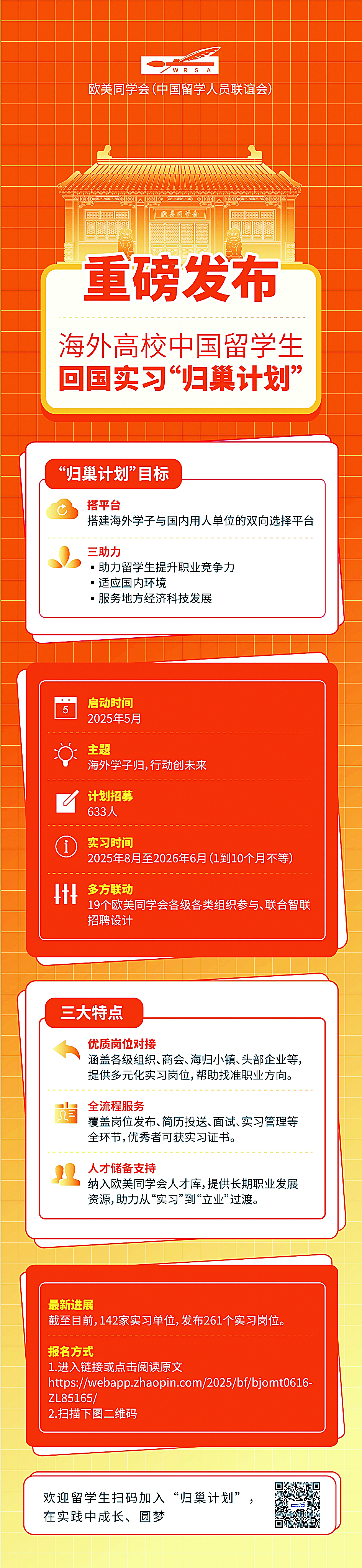 首届“归巢计划”自2025年5月启动,已吸引142家实习单位发布了261个实习岗位,计划招募633人参加实习。