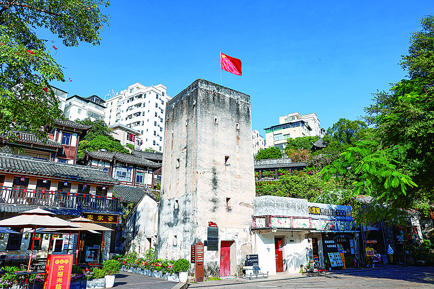 从龙岗区吉华街道甘坑古镇正门往内,步行约百米便可见一座四层楼高的炮楼。炮楼久经风雨、日渐沧桑,四壁斑驳的墙体上仍遍布着抗战时期的弹痕,似乎在无声诉说着那段烽火连天的峥嵘岁月。