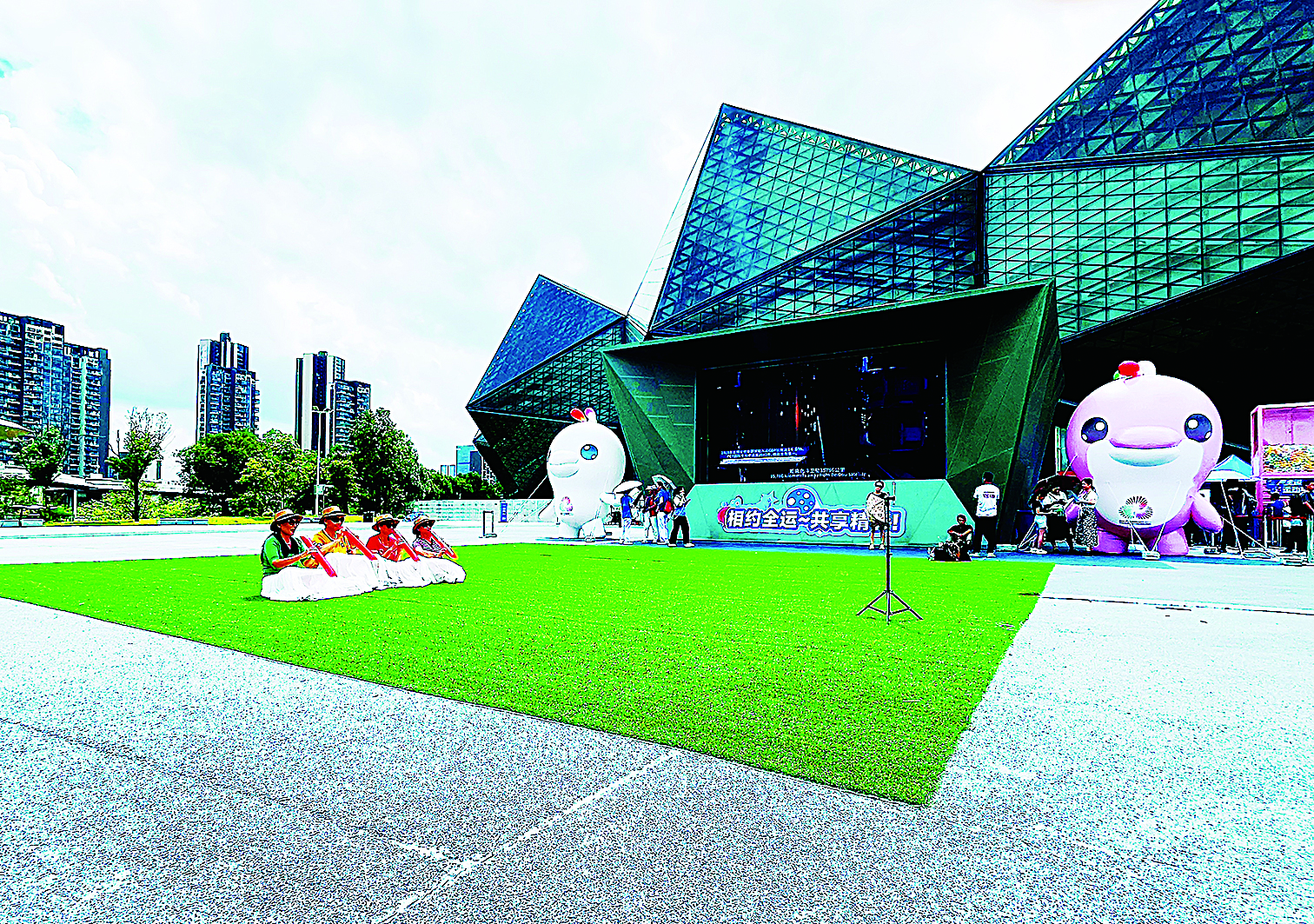 现在的深圳大运中心广场变身欢乐的海洋,巨型“喜洋洋”“乐融融”热情地守在场馆入口,从清晨到日暮,打卡合影的市民络绎不绝。家住附近的陈茗女士带着孩子连续三天前来报到:“这里成了我们的遛娃宝地,娃娃每天都要和吉祥物握握手才肯回家。”