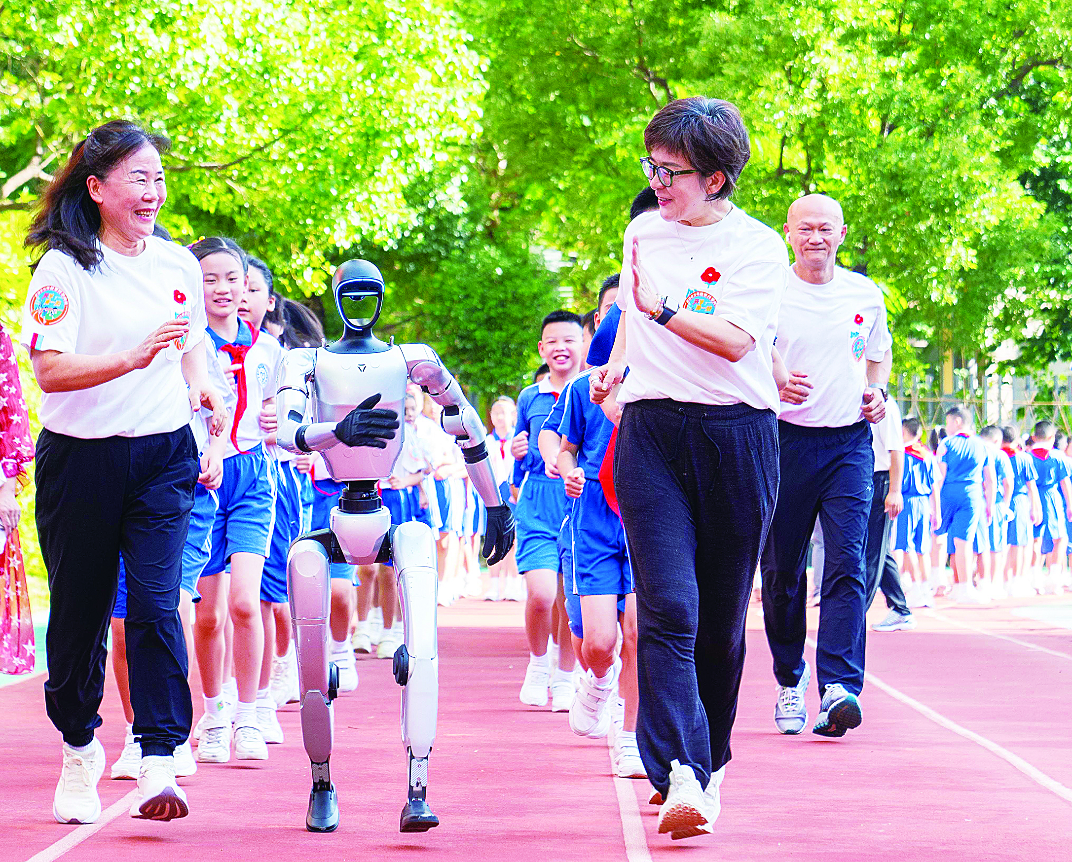 值得关注的是麓城外国语小学的“机器人领跑”开学活动。当天8时许,2000多名师生齐聚操场,随着发令枪响,全场瞬间沸腾。两个机器人、一条机器狗迈着整齐的步伐领跑,校长带领第一方队紧随其后,学子们排着队伍,伴着欢快的音乐迈开脚步,形成一道充满科技活力的风景线。“以前晨跑总觉得有点累,今天跟着机器人跑,感觉浑身都有劲儿!”“我是第一次跟机器人跑步,很开心,也很惊讶!”学生纷纷表示跟着机器人跑步太酷了。据介绍,此次活动灵感源于2025世界人形机器人运动会,“我们就是想让AI元素融入日常,让孩子们在快乐中感受科技的魅力。”该校相关负责人说道。
