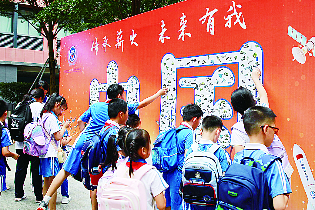“这贴纸贴在‘中国’二字上,感觉自己也成为传承历史的一份子!”同日,龙城高级中学集团宝龙外国语学校的学生手持军工造型贴纸,郑重贴在主题背景板上。当天,该校以“传承薪火,未来有我”为主题开启开学迎新活动。