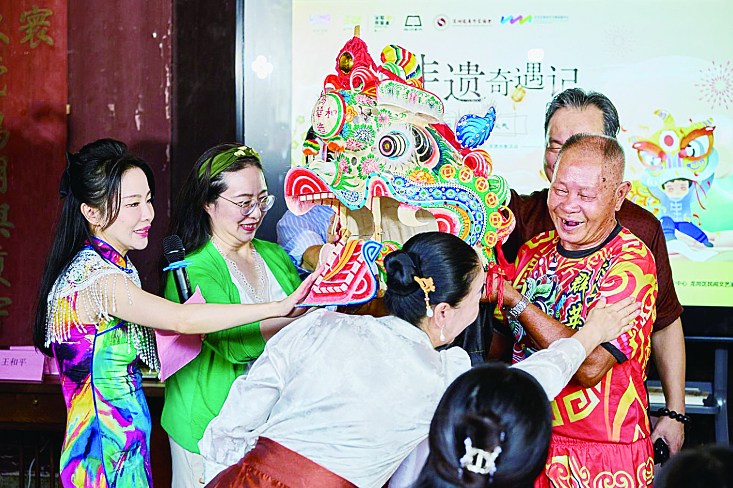 麒麟舞传承人刘石养和刘福钦精彩阐释麒麟舞的文化内涵。作为岭南文化的典型代表和客家文化的重要组成部分,省级非遗项目——五联朱古石麒麟舞表达迎祥纳福、祈求风调雨顺的美好愿望,展现出浓厚的客家民间传统文化魅力。81岁高龄的刘石养现场即兴表演一段“摆头”架势,其威猛矫健的身段令现场观众热血沸腾,掌声、欢呼声此起彼伏。最后,观众纷纷上前抚摸麒麟,或举起麒麟头“有模有样”地舞动一番,祈祷吉祥如意、风调雨顺、国泰民安,现场气氛热烈空前,将活动推向最高潮。