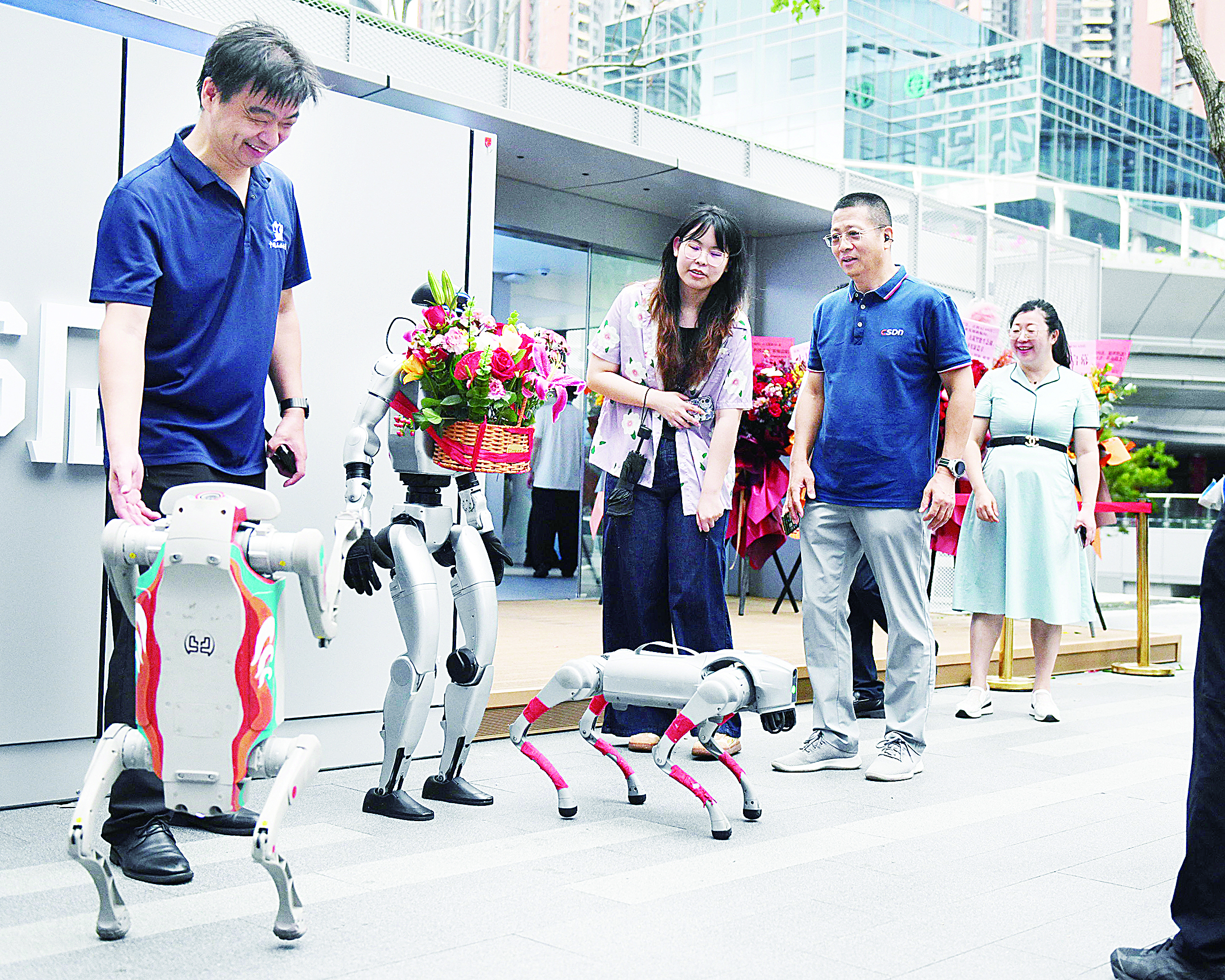 昨日,全球首家人工智能6S店在深圳龙岗机器人街区开业。该6S店创新整合“展示(Show)、销售(Sale)、培训(School)、社群(Social)、解决方案(Solution)、孵化(Startup)”六大服务功能,形成全新的人工智能产业服务模式。图为市民与机器狗互动。龙岗融媒记者 张臻斐 摄
