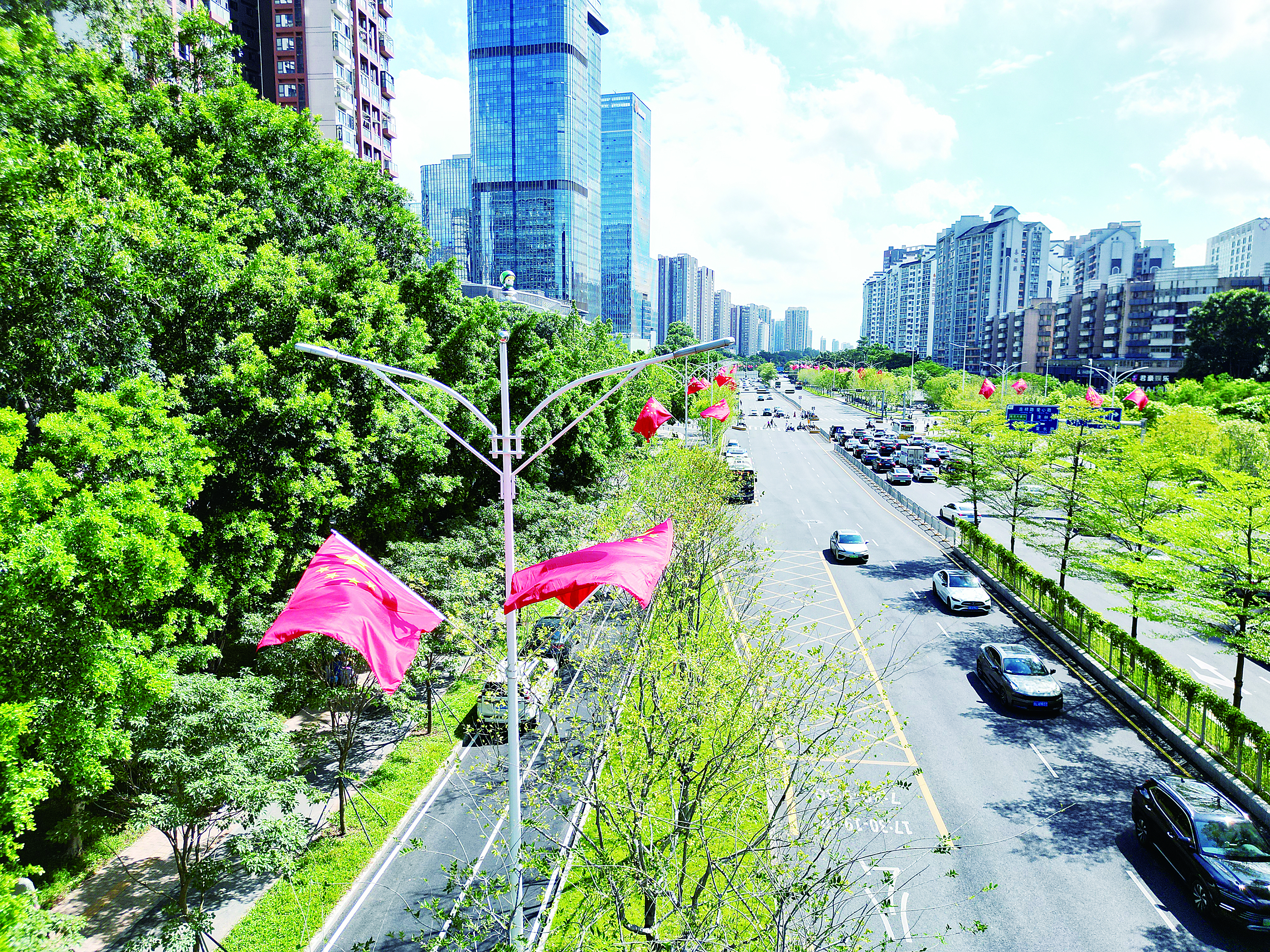 中秋国庆双节将至,龙岗区提前部署节日氛围营造工作,于9月26日启动主干道国旗悬挂施工,总计将悬挂国旗4618面。如今行走在龙岗区13条城市主干道,均可见“中国红”,以庄重热烈的氛围迎接双节到来。图为龙平路国旗飘扬。 龙岗融媒记者 黄珍珍 张臻斐 摄影报道