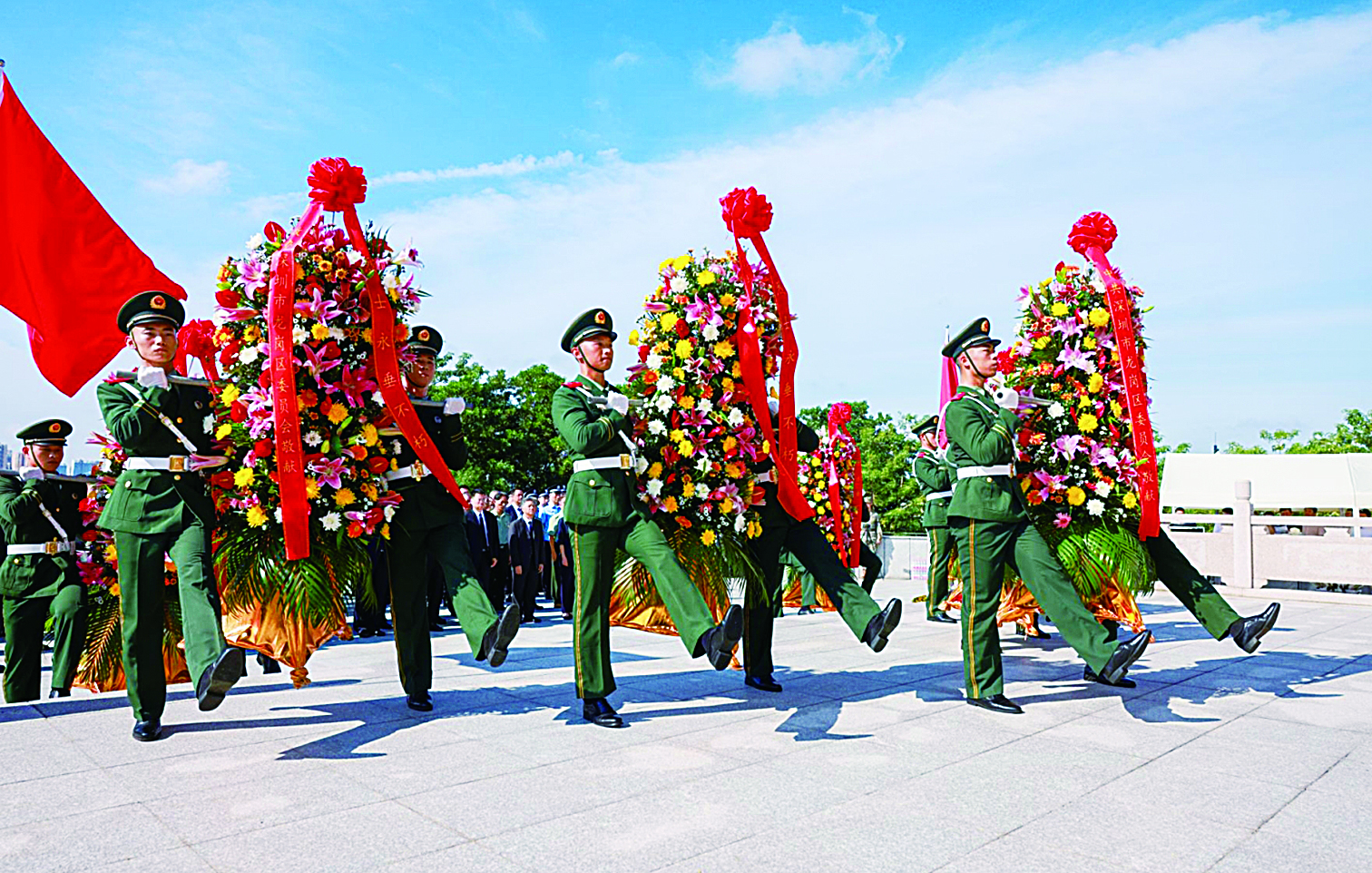 在深情的《献花曲》中,14名礼兵托起花篮,迈着庄重的礼步缓步走向纪念碑,将花篮摆放在纪念碑前。花篮的红色缎带上,“烈士永垂不朽”的金色大字熠熠生辉。参加仪式的区领导稳步上前,仔细整理花篮缎带。随后,参加仪式的全体人员依次拾级而上、缓步绕行,瞻仰纪念碑,献上手中鲜花,表达对先烈们的深切缅怀和崇高敬意。