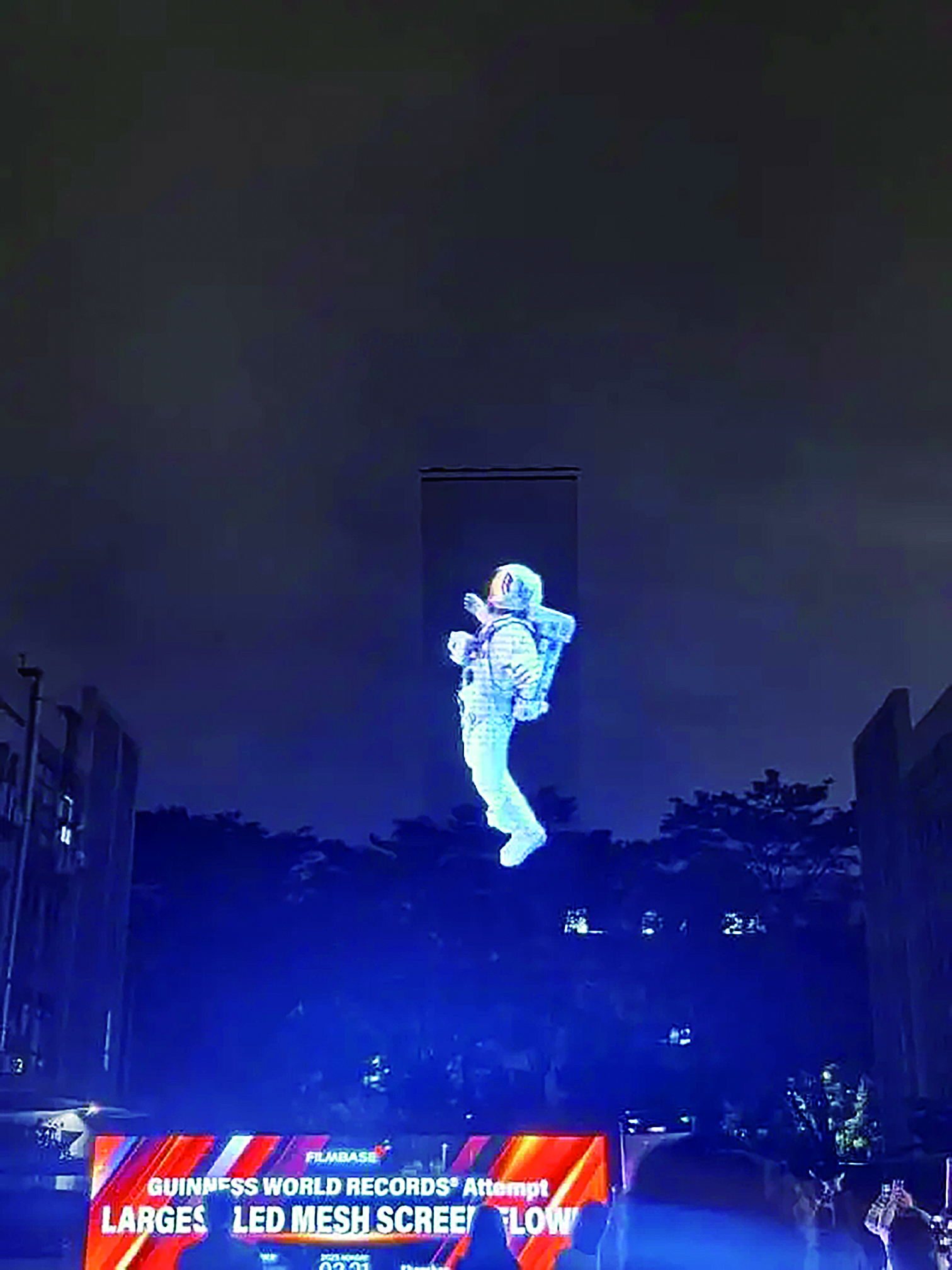 彼时,一块显示面积达到72.66平方米的“飞天屏”在龙岗的夜空中冉冉升起,飞机升空、火箭上天、宇航员悬浮等画面在屏幕中不时以动态闪现,其惊人的视觉效果不仅吸睛无数,引来众多市民驻足围观,更一举创造了新的吉尼斯世界纪录。