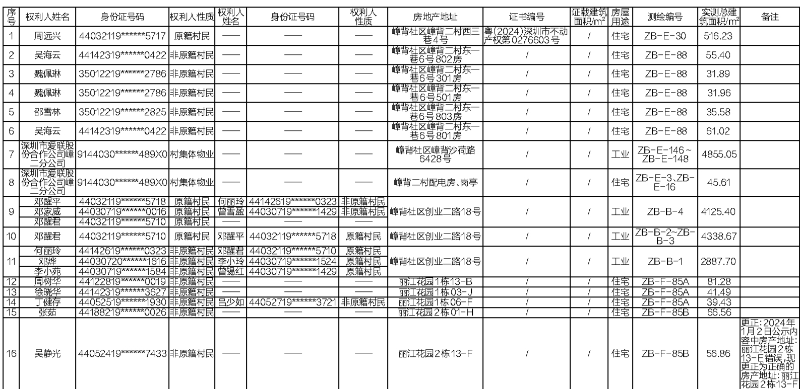 因实施深圳市龙岗区龙城街道嶂背社区土地整备利益统筹项目,需要拆迁下列红线范围内的房屋及其附属物,现将拆迁房屋产权人公示如下(详见附表)。相关人员如对本公示房屋权利人有异议的,请在自公示之日起7天内带齐产权资料到深圳市爱联股份合作公司核实。未提出异议或逾期提出异议的,视为对本权属核查结果无异议。