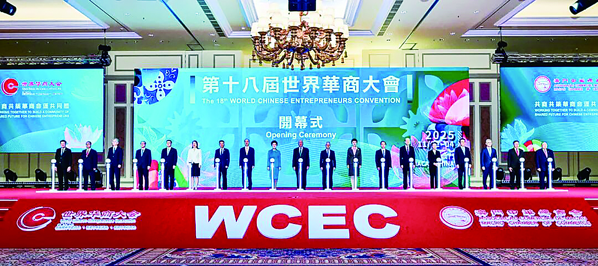 全国政协副主席何厚铧、咸辉,中央和国家机关有关部门、有关团体负责同志,澳门特别行政区行政长官岑浩辉及相关政府官员,中央驻澳机构主要负责同志,以及来自全球50多个国家和地区的华商代表、专家学者、政企界人士共4000余人参会。