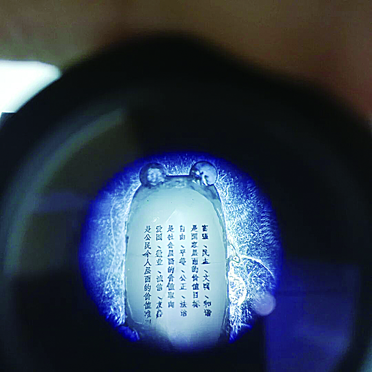 在金洲的实验室里,一把其貌不扬的超精密铣刀正在明亮的灯光下飞速运转。只见它将细如针尖的刀体对准一粒细小的米粒,不一会儿,铣刀在米粒上精准游走,一个个形状方正的汉字逐渐浮现……