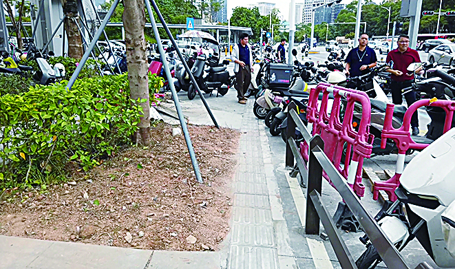 本报讯 (龙岗融媒记者 乔声) 近日,龙岗融媒“龙岗民声”栏目接到市民反映称,石芽岭地铁站A2出口外原本宽敞的人行道,如今已被各类电动自行车“鸠占鹊巢”,仅留下一条狭窄的通道供行人通行,甚至人行通道出入口也常被乱停放的电动自行车堵死,行人出行可谓举步维艰。
