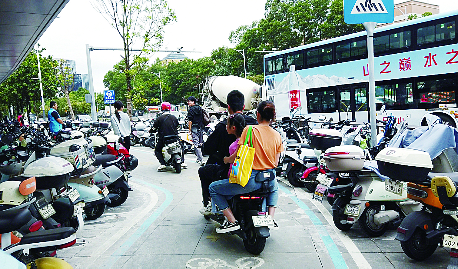 更令人无奈的是,这条本已捉襟见肘的通道,在一端出口处,还常常被几辆横七竖八停放的电动自行车完全堵住,沦为“断头路”。行至此处的市民,只得冒险绕行非机动车道,穿梭于身旁疾驰而过的车流之间,现场险象环生。