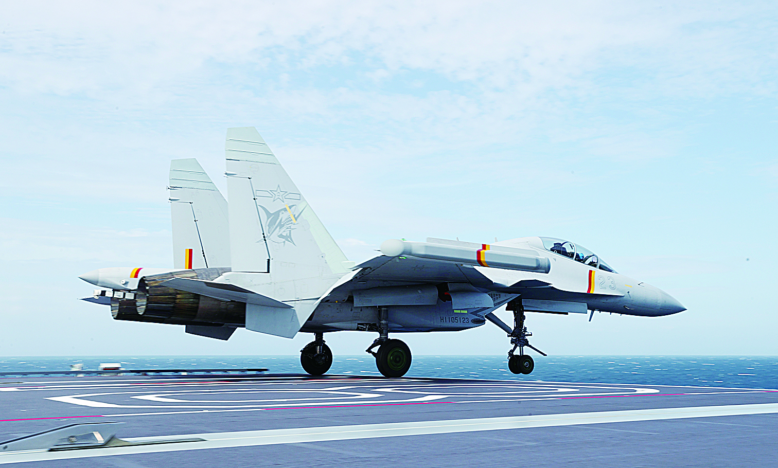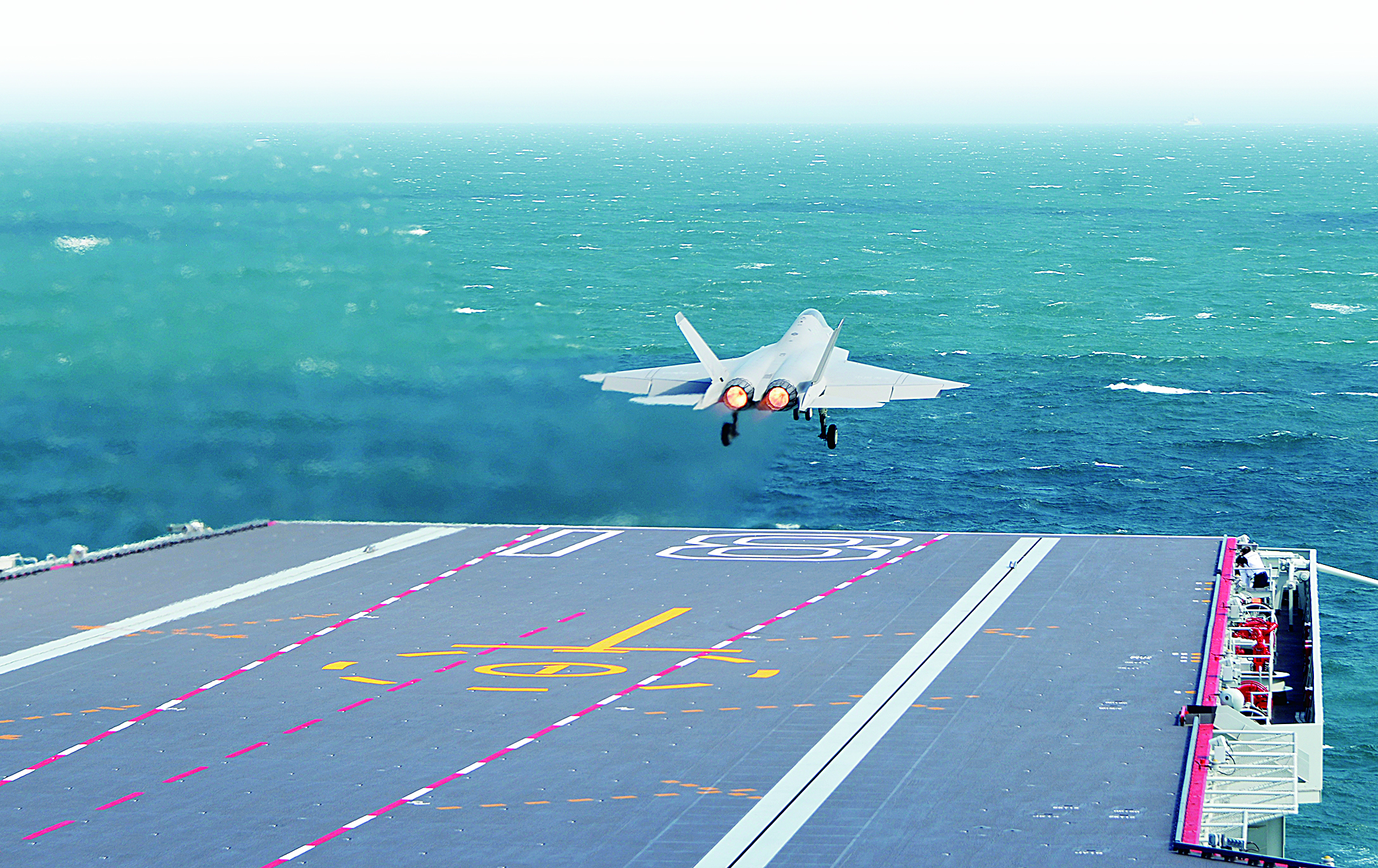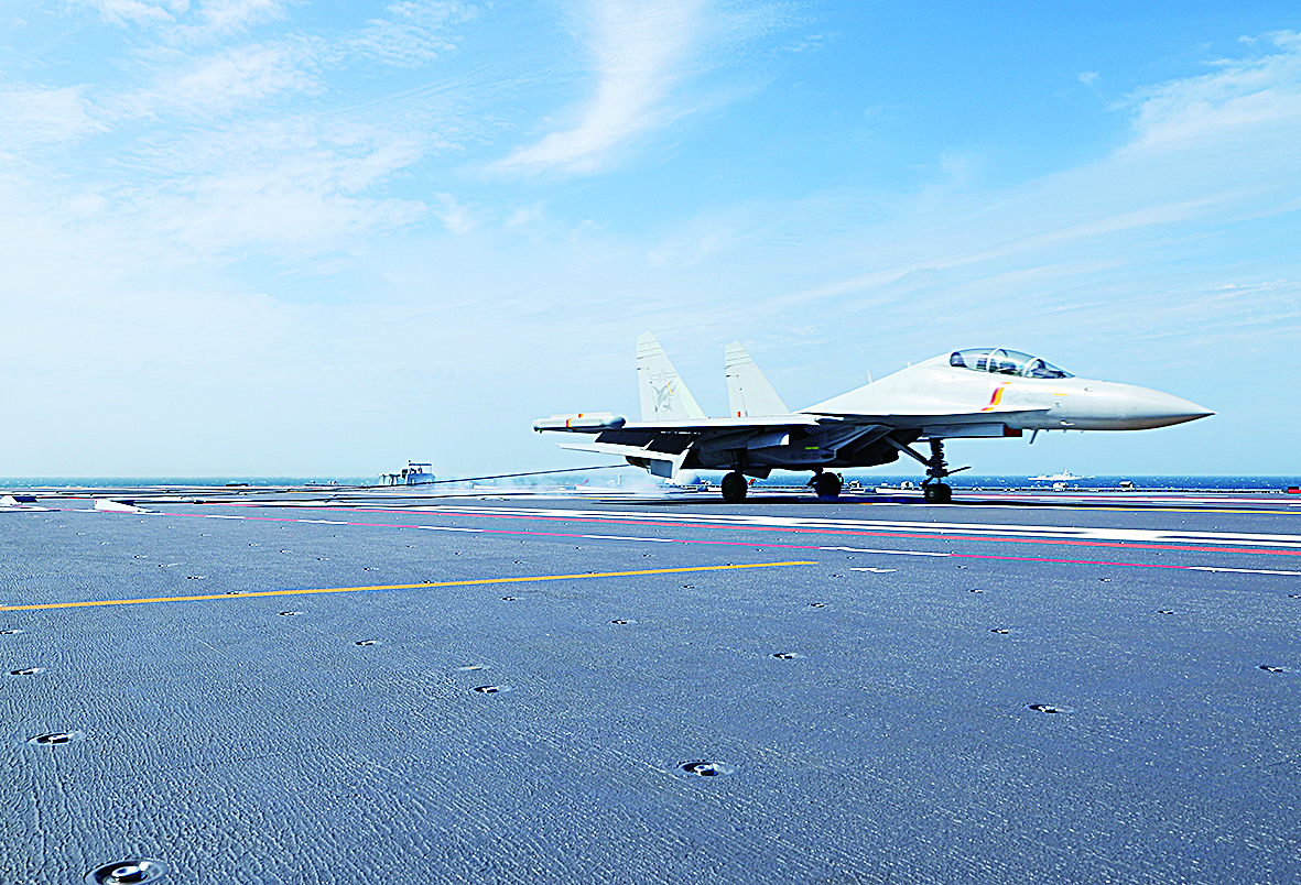 歼-15DT舰载机着舰。