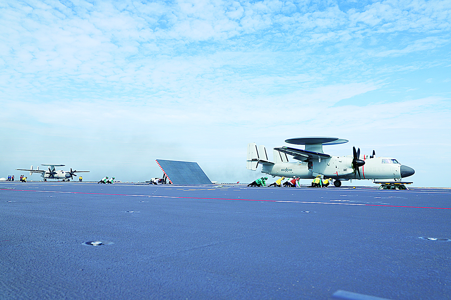 空警-600舰载固定翼预警机接续弹射起飞。