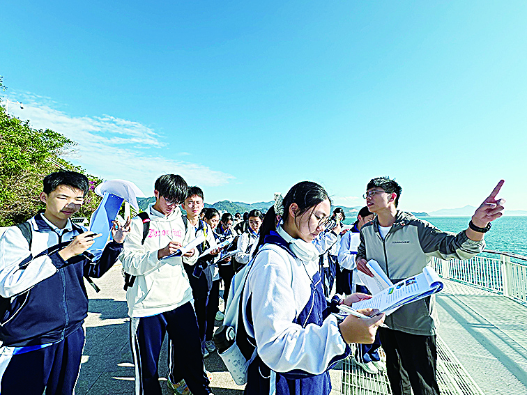 随后,生物教师周佳琳带领大家切换“生态探索者”视角。栈道旁叶片肥厚的滨海植物、盘旋于海面的海鸟、礁石缝隙中的小型生物,都成为研究对象。同学们通过观察、记录、提问,逐步解锁生物适应海风、高盐、强光等特殊环境的生存“超能力”,在自然中印证课本知识。