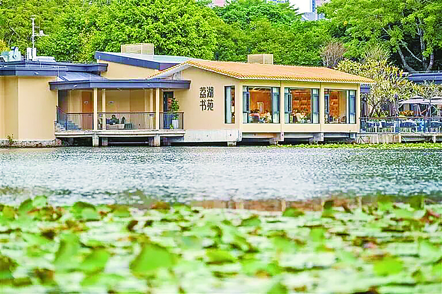 荔枝公园荔湖书苑把阅读延伸至湖畔,抬眼就看到近处睡莲、成群结队的鸭子和远处水榭廊桥、现代化楼宇同处一幅画中……