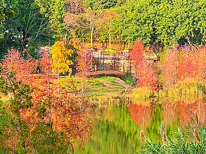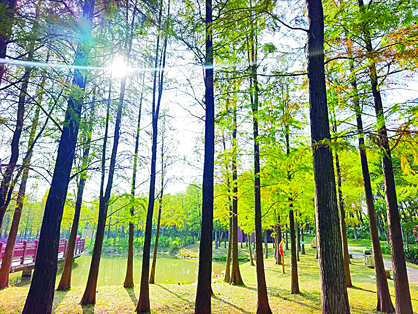 如果你喜欢安静漫步,欣赏水岸与植物交织的画面,那么红花岭低碳生态公园正适合你。水库边、花海旁,落羽杉正从翠绿渐变成金黄,再透出淡淡的绯红,倒映水中,静谧如画。