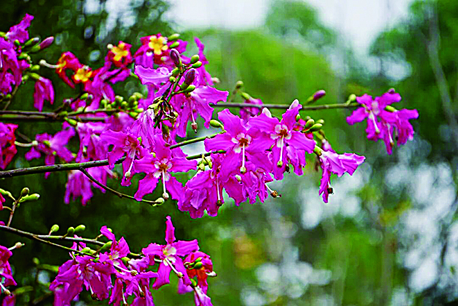 喜欢一边散步一边赏花的你,不妨来八仙岭公园走走。西北广场附近的美丽异木棉正在盛开,挺拔的树干上绽放出大朵粉红的花,远望如云霞栖枝,温柔又治愈。