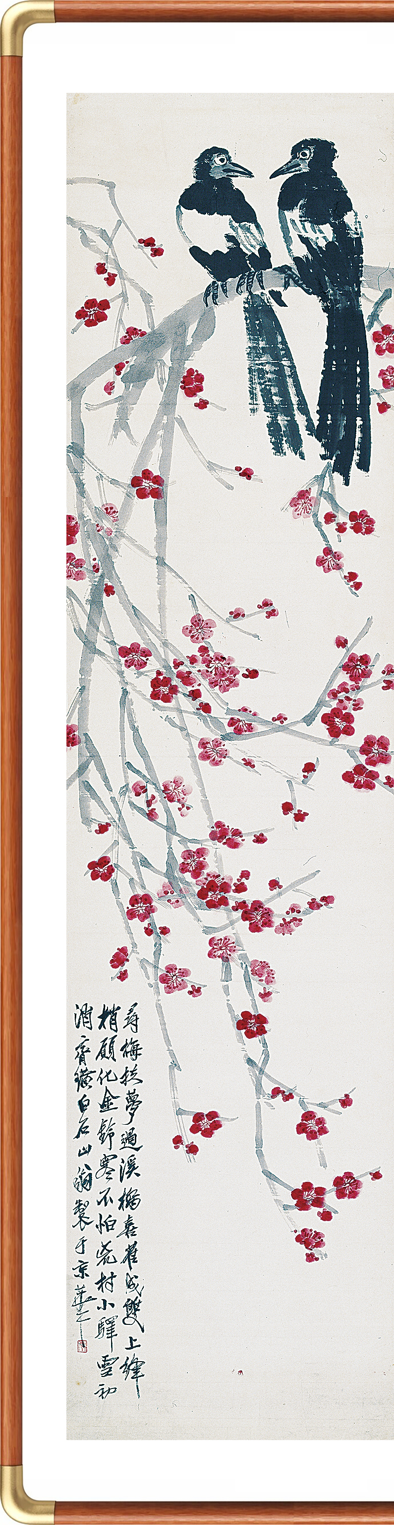 展览中,吴昌硕金石气息浓郁、笔力苍茫的作品,与齐白石“红花墨叶”、生趣盎然的画风相互映照,既有文人画的逸趣精神,也饱含鲜活的时代气息,生动诠释了中国花鸟画独特的审美意蕴。