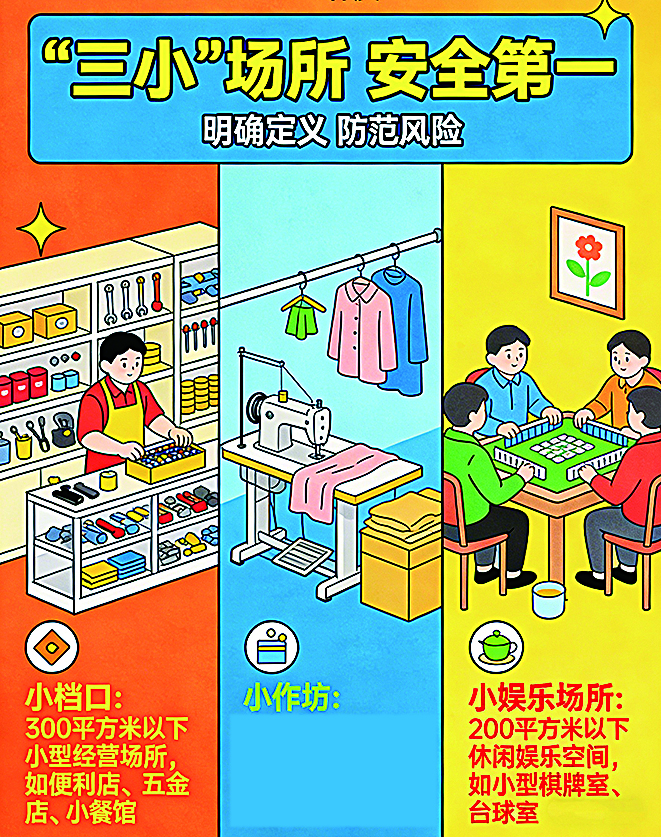 “三小”场所是小档口、小作坊、小娱乐场所的统称,是商住一体建筑中最为常见的经营形态。其中,小档口指建筑面积在300平方米以下的小型经营场所,街边的便利店、五金店、小餐馆都在此范畴;小作坊的界定标准为建筑高度不超过24米,且每层建筑面积在250平方米以下,多见于服装加工、食品制作等小型生产加工场所;小娱乐场所则是建筑面积在200平方米以下的休闲娱乐空间,如社区内的小型棋牌室、台球室等。