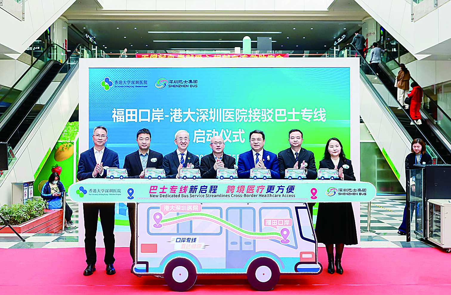 本报讯 (深圳侨报记者 谢青芸) 为进一步推动跨境医疗服务衔接,促进医疗与民生融合,香港大学深圳医院(以下简称“港大深圳医院”)与深圳巴士集团合作,正式开通“福田口岸—港大深圳医院”接驳巴士专线。1月5日,“福田口岸—港大深圳医院”接驳巴士专线启动仪式在港大深圳医院举行,随着首台接驳巴士缓缓开出,标志着粤港澳大湾区民生融合从“政策便利”迈向“体验优化”。