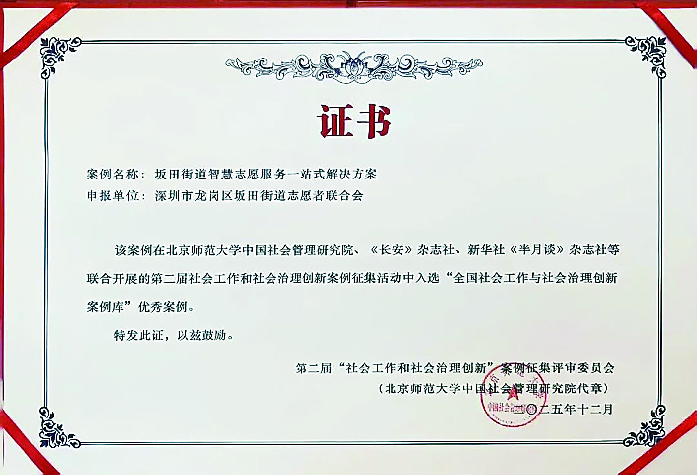好消息!龙岗志愿服务再获国家级认可!在近日举办的第十四届中国社会治理论坛上,第二届全国“社会工作与社会治理创新”案例征集活动结果正式揭晓。由龙岗区坂田街道申报的“智慧志愿服务一站式解决方案”经过激烈角逐,从全国1211个参评案例中脱颖而出,荣获“优秀案例”。
