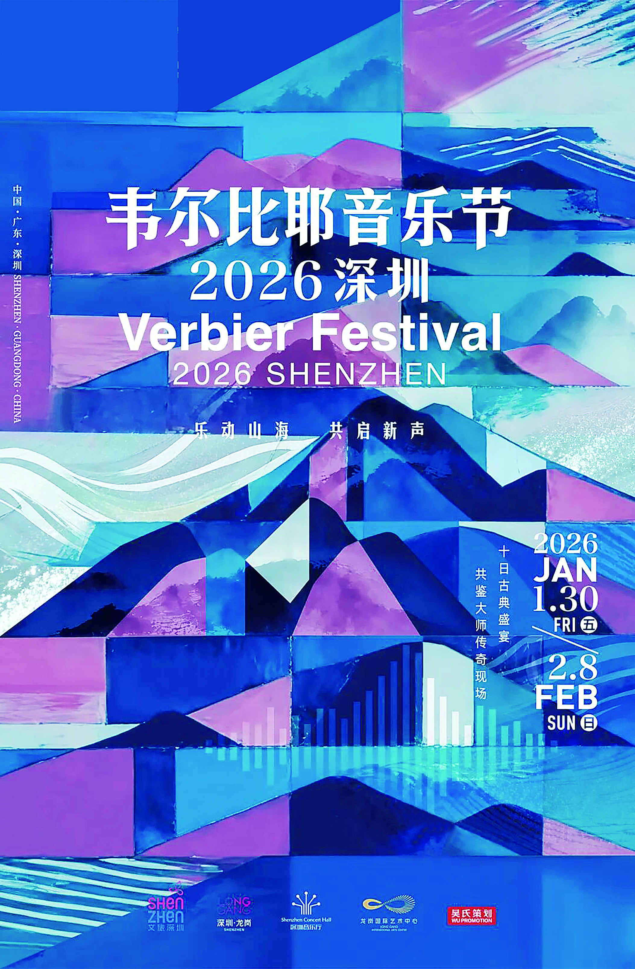 全球瞩目的顶级古典音乐盛会韦尔比耶音乐节,将于2026年1月30日至2月8日在深圳举办,本届音乐节为期10天,精心策划23场音乐会,涵盖7场交响乐与16场室内乐、独奏演出,其中6场演出将在龙岗国际艺术中心精彩上演。图为韦尔比耶音乐节2026深圳海报。龙岗区文化广电旅游体育局供图