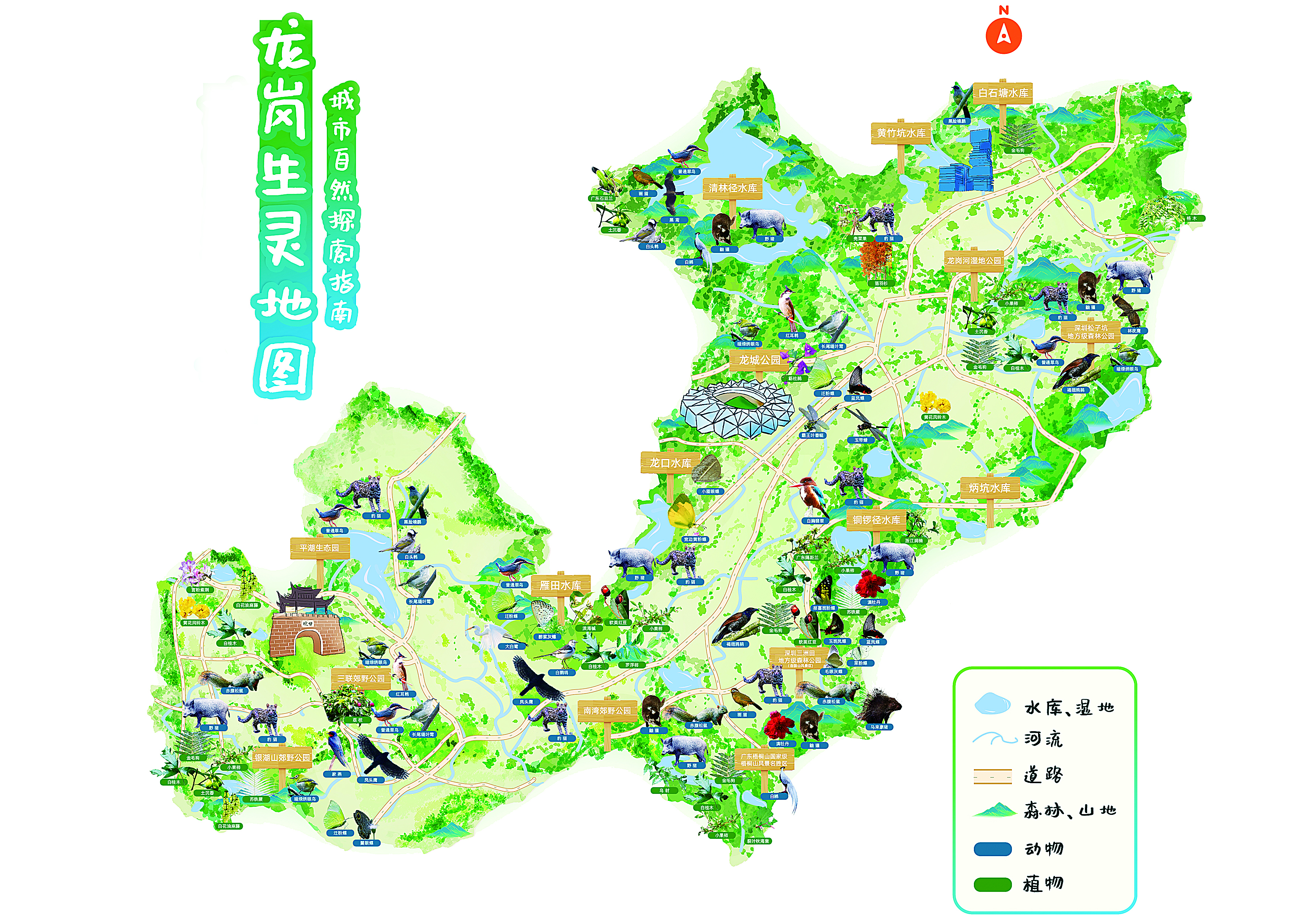 在深圳龙岗,清晨的龙城公园里,鸟儿在树梢间清脆鸣唱,松鼠于林地上轻快跃动,这些灵动身影与远处城市的楼宇天际线,共同构成一幅“城野交融”的和谐画卷。这幅画卷的绘就,正是得益于龙岗区正在深入实施的“城市生灵守护计划”。该计划由深圳市生态环境局龙岗管理局与区城市管理和综合执法局共同推动,旨在通过系统性的生物多样性保护与提升行动,将鲜活的生态福祉深度融入城市肌理,谱写人与自然共建生命共同体的新篇章。图为龙岗生灵地图。受访单位供图