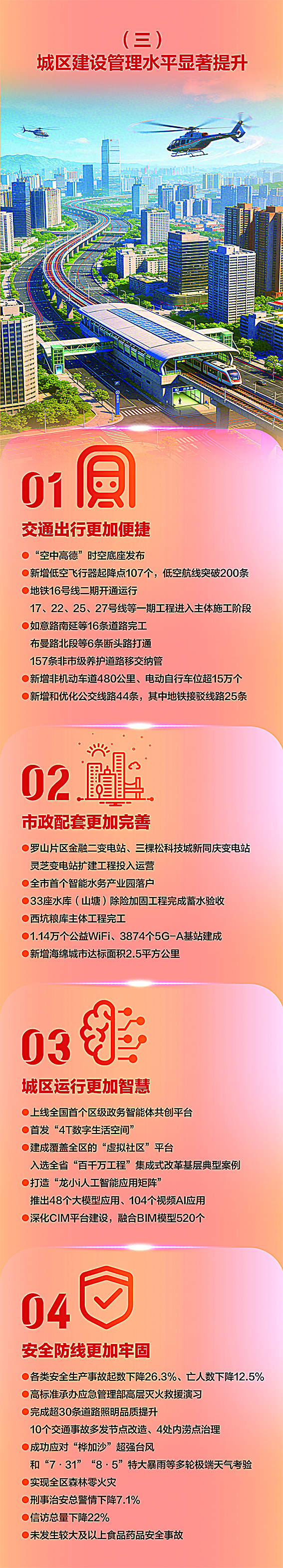 1月27日,龙岗区七届人大七次会议开幕,区长王策飞向大会作政府工作报告。过去一年,龙岗在经济发展、城区建设、民生保障等各方面工作上取得了哪些成果?站在“十五五”规划新起点,2026年龙岗将开展哪些重点工作?AI带你一图了解。