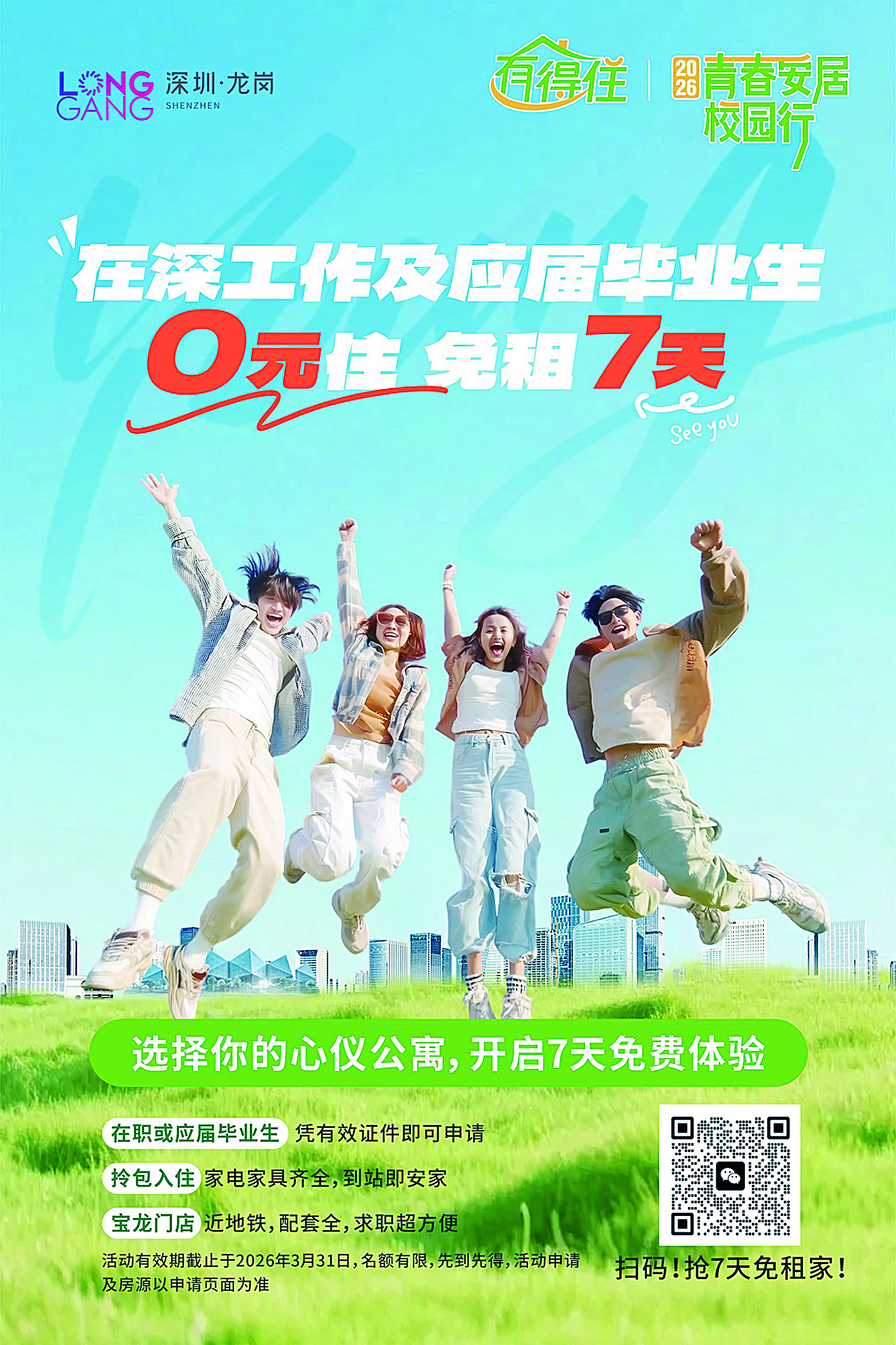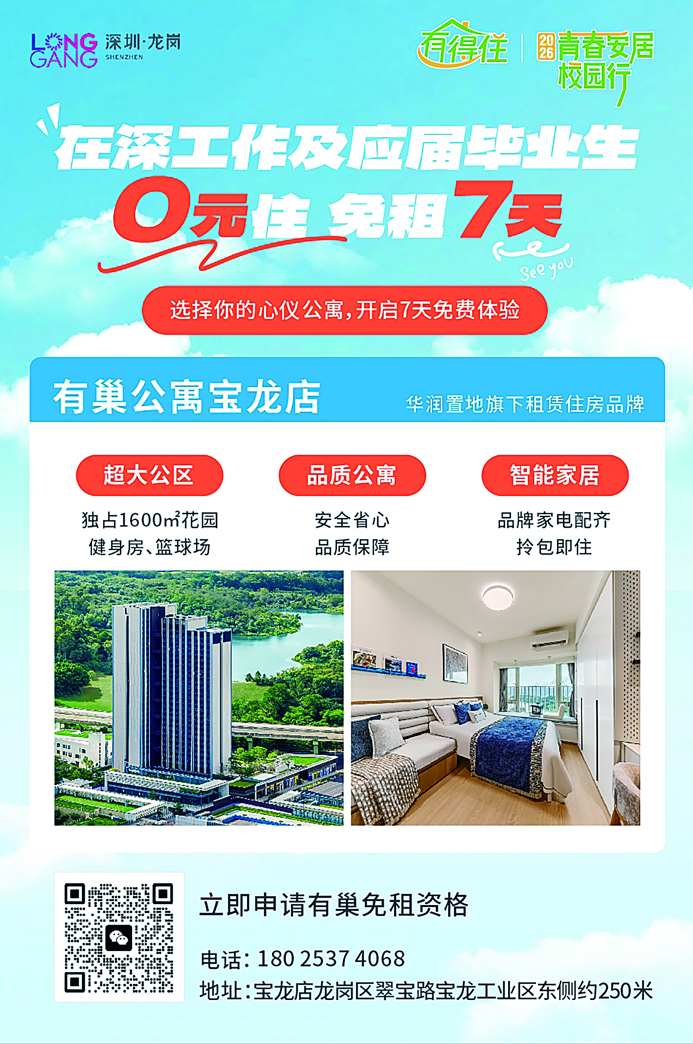 龙岗区住房和建设局相关负责人表示:“我们深知求职初期的每一步都不易。推出本次活动,正是龙岗以细致入微的关怀,为青年人才卸下‘第一步’的重担,让大家真切感受到这座城市的温度与诚意。我们不仅希望提供临时的落脚点,更希望能成为大家选择龙岗、融入龙岗、与龙岗共同成长的起点。”诚邀各位青年人才踊跃参与,解锁免租福利,扎根龙岗、逐梦湾区,书写属于自己的青春华章。