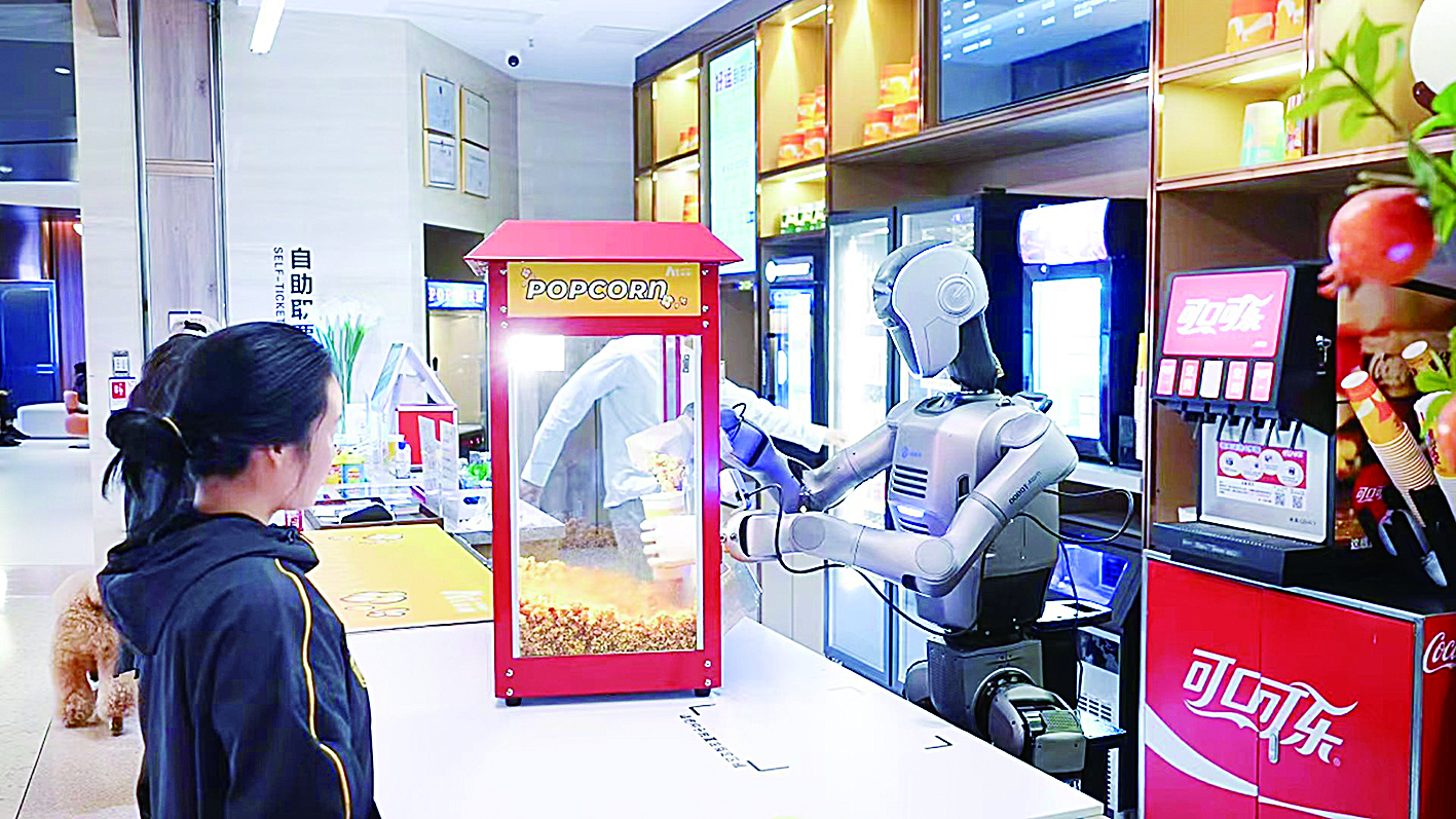 “哇,这个机器人好灵活!”“太快了吧,一杯爆米花几秒钟就做好了”……在深圳K11 Art House电影院的爆米花售卖区,围满了驻足围观、拍照打卡的市民和影迷,而人群的焦点,正是越疆科技推出的全自主人形机器人“显眼包”员工。它身姿挺拔、动作利落,抓取纸杯稳准狠,装填爆米花不洒一粒,递货时还会轻轻点头示意,全程不用人工搭手,14小时连轴转不“偷懒”,一天就能做出1000多杯爆米花,创下近2万元营收,用实力圈粉无数,也让大家直观感受到了中国智造的魅力。