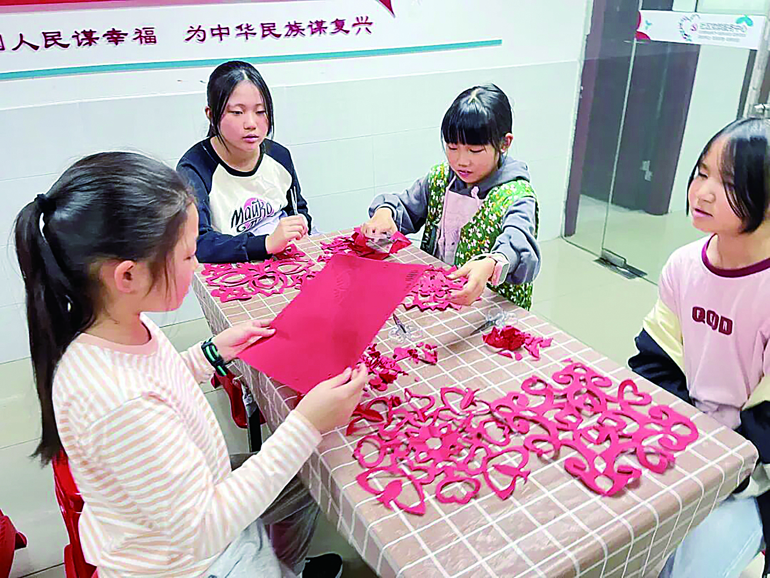 一张张普通的红纸逐渐变成了形态各异的窗花,寓意美好的福字、象征民族团结的同心图案,现场氛围热闹而温馨。