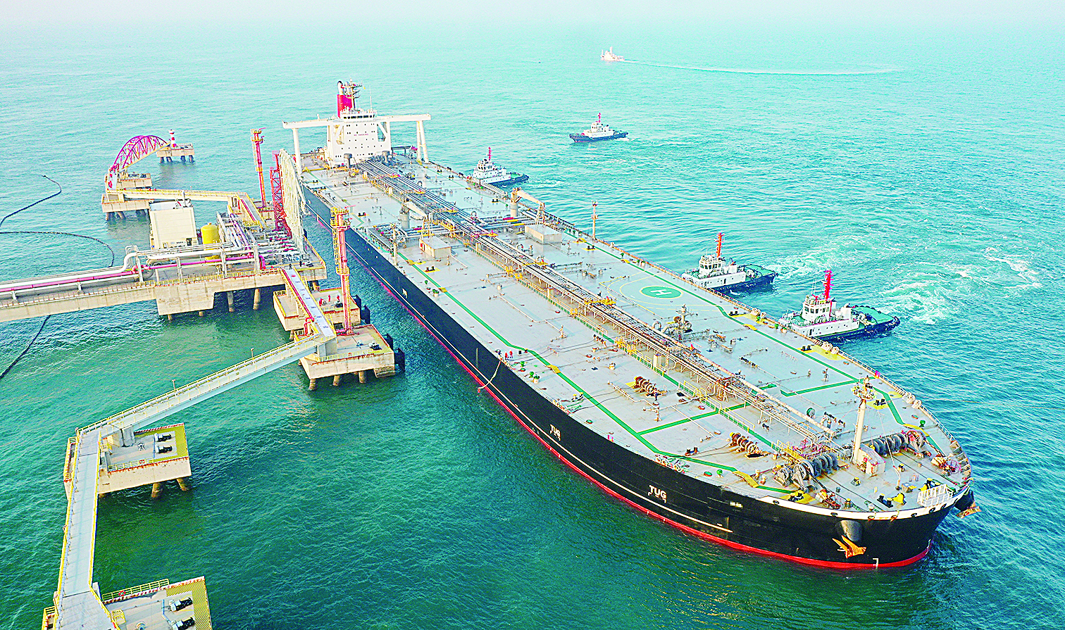 2025年12月18日,一艘装载着石化原辅料的外籍船舶泊入位于海南省儋州市的国投洋浦油储码头30万吨级原油泊位(无人机照片)。自2025年12月18日起,海南自由贸易港正式启动全岛封关。据新华社
