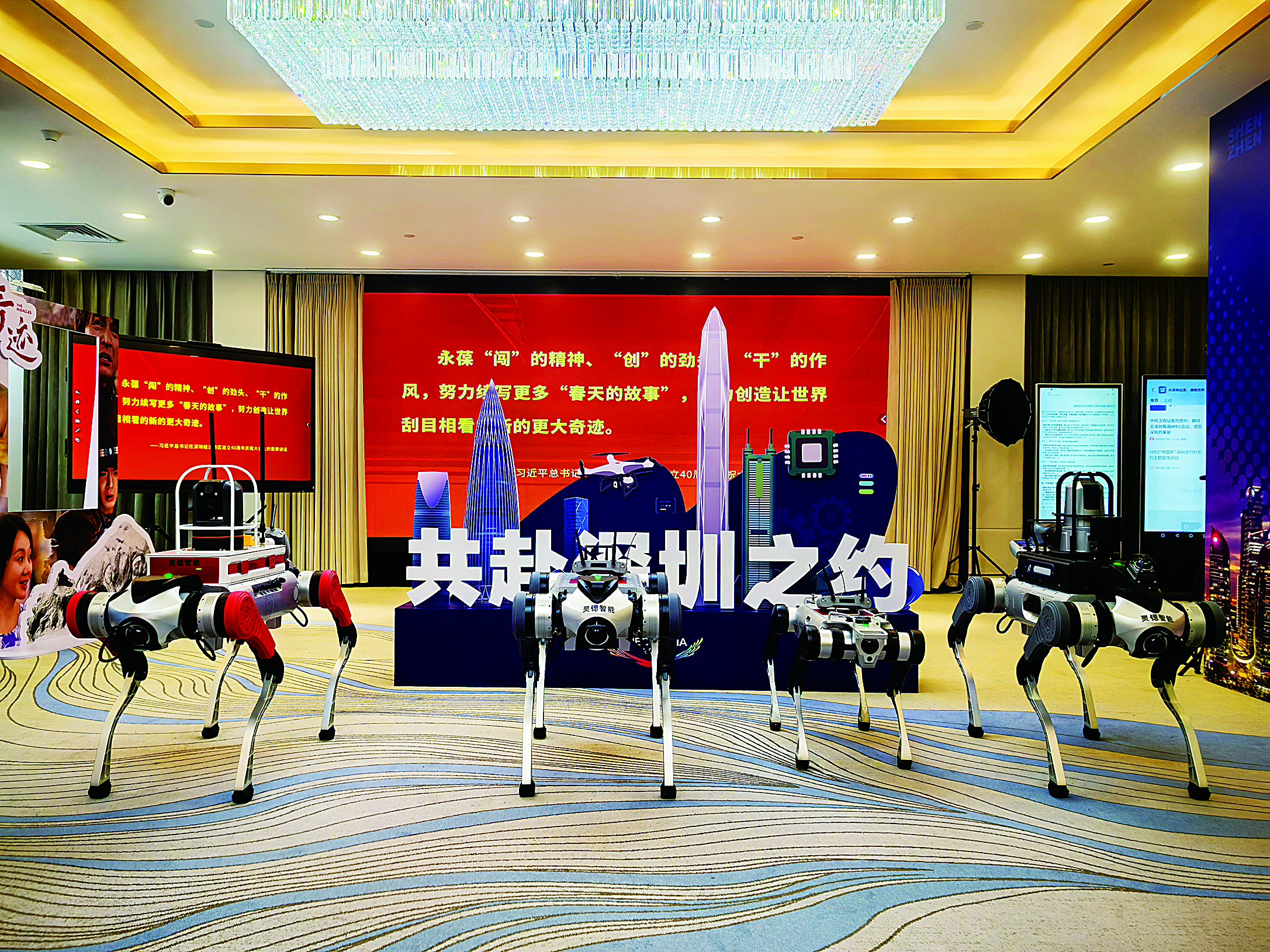 3月,北京迎来“两会时间”。在此期间,一场名为“硬核广货 智慧随行”的AI硬核圳品展也火热进行。其中,“一只机器狗稳稳驮着记者和摄影设备”的短视频在各平台“出圈”,让深圳龙岗企业——广东灵锶智能科技有限公司,意外成为“网红”。作为珠三角唯一一家代表机器狗进入全国两会融媒会客厅的企业,灵锶智能带来的不仅是“吸睛”的表演,更是深圳机器人产业硬核实力的集中亮相。图为灵锶智能机器狗走进全国两会融媒会客厅。受访单位供图