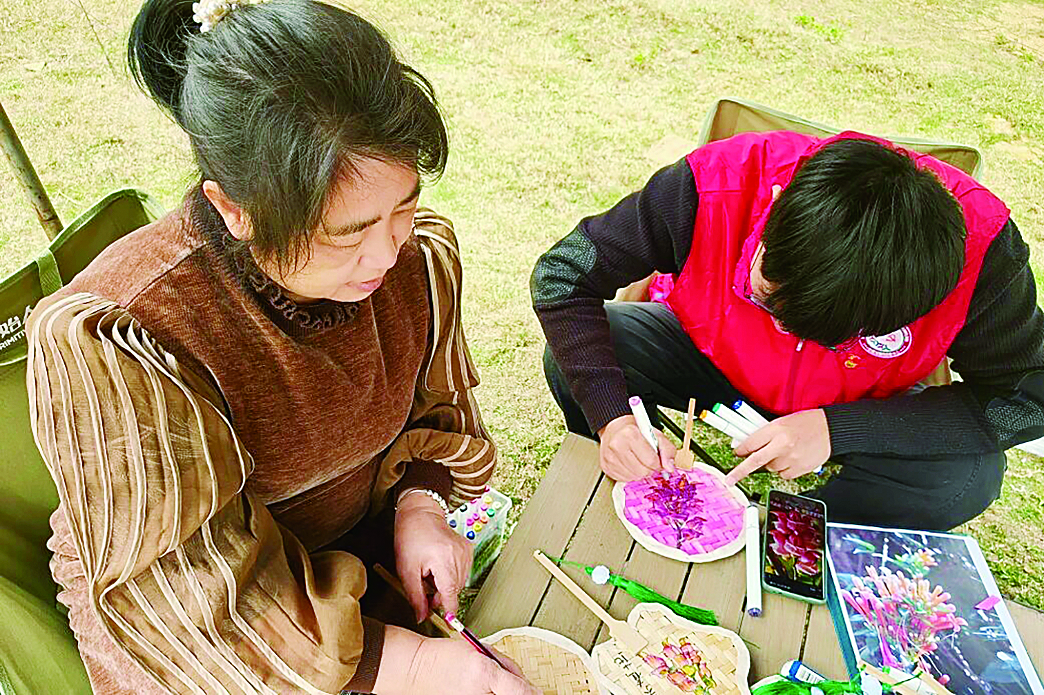在竹编手作环节,工作人员详细讲解竹编扇子的制作技巧,大家巧手翻飞、精心编织扇面,并以画笔勾勒金龟本土禾雀花、炮仗花等春日元素。一编一画间,非遗韵味与家乡春色跃然指尖,让居深乡亲和侨胞侨眷们近距离感受传统文化的独特魅力。活动中,大家互相交流创作心得,分享生活中的美好瞬间,在协作与谈笑间拉近彼此的距离。侨眷邱阿姨表示:“和大家一起动手做手工、聊聊天,感觉特别充实,这样的活动很有意义。”