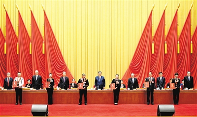 在欢快的乐曲声中,习近平等为受表彰的模范个人和模范集体代表颁奖。