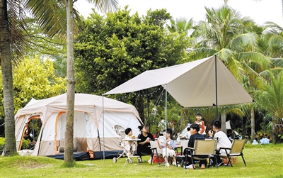 10月7日,在中澳友谊花园,不少市民搭起帐篷,享受户外露营乐趣。市民朋友围坐一起,孩子们在草地上嬉戏,欢声笑语不断。 本报记者张锋锋摄影报道