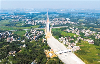 从高空俯瞰,湛江机场高速与调顺跨海大桥联通,构筑了一幅生态和谐的美丽画卷。 本报记者郎树臣 摄