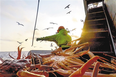 金秋时节,俄罗斯远东堪察加半岛附近海域,俄罗斯蟹业集团的捕捞船在风浪中紧张作业,工作人员对捕捞的帝王蟹进行收网、挑选、加工、装箱、储存,准备装运。一整套流程在捕捞船上有条不紊地进行。备受中国消费者青睐的俄罗斯帝王蟹由此开启中国之行。