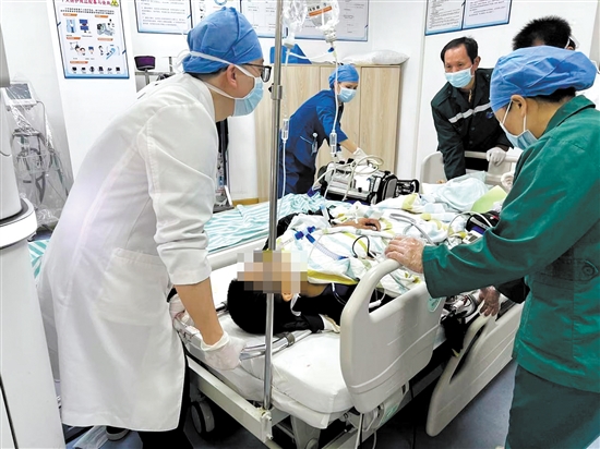 第一位患者是67岁的廖伯,因突发脑出血,陷入昏迷2个小时。送到医院时,患者已处于濒危状态,生命迹象微弱。急诊科团队迅速接诊,保护好患者气道,做好心电监护。“经过头颈CTA的检查,发现患者颅内大量出血,合并脑疝情况,属于急危重症。”该院急诊科副主任医师邓文斌说。