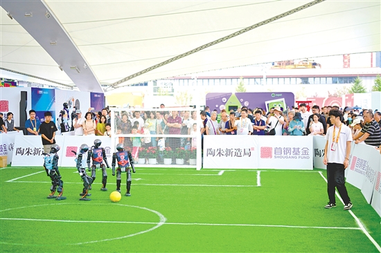 人们在2025年服贸会体育服务专题展区观看人形机器人踢足球。新华社发