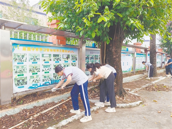 我市各校积极开展爱国卫生运动。图为麻园中学师生清理校园内落叶和杂物。学校供图